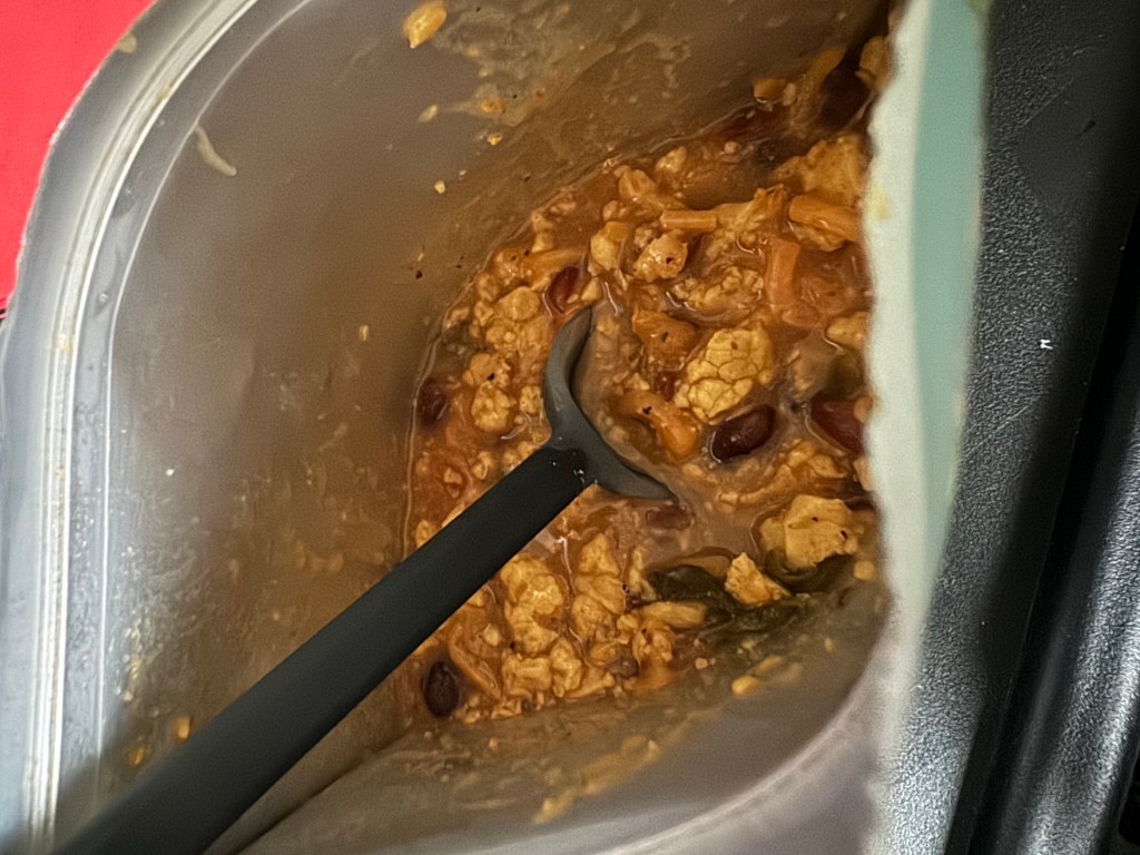 This is edible but not great, from the comfort of home. I immediately added soy sauce because that helps anything, but this has 59% of the daily allowance of sodium so that’s probably not a great idea. Though if I have been sweating on a hike the level of sodium isn’t as big a deal. The soy sauce improved it from bland to mediocre.